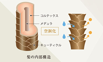 空洞化の原因は日常生活のあちこちに。髪の毛は、外側を守るキューティクル、繊維状のたんぱく質「コルテックス」、たんぱく質と脂質から成る「メデュラ」からできており、キューティクルがはがれるとメデュラとコルテックスが漏れ出し、空洞になってしまいます。