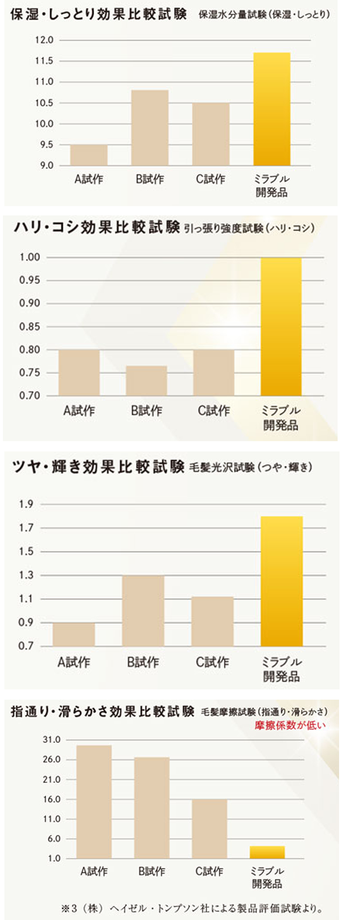 ミラブルのために生まれたシャンプー/トリートメントの製品評価は、自社と(株)ヘイゼル・トンプソン監修に基づく実験結果です。